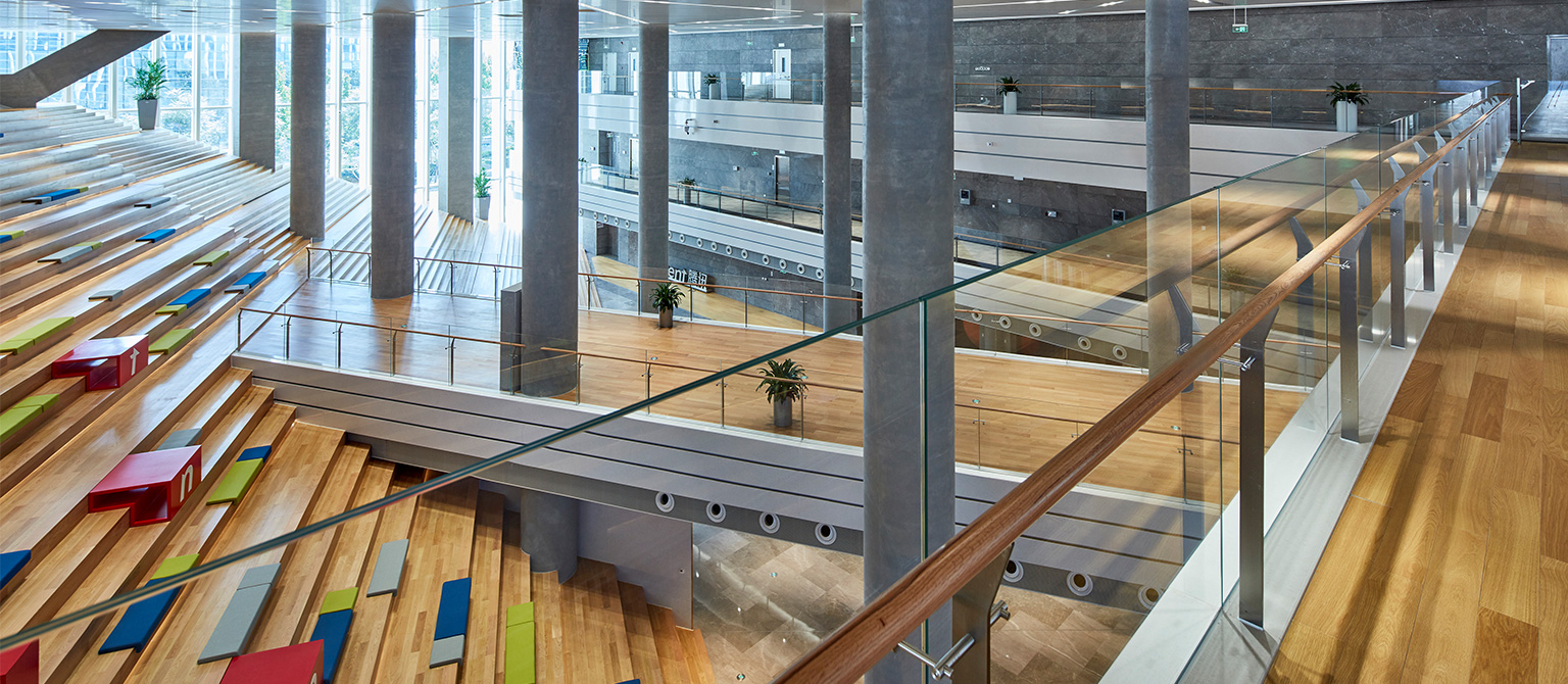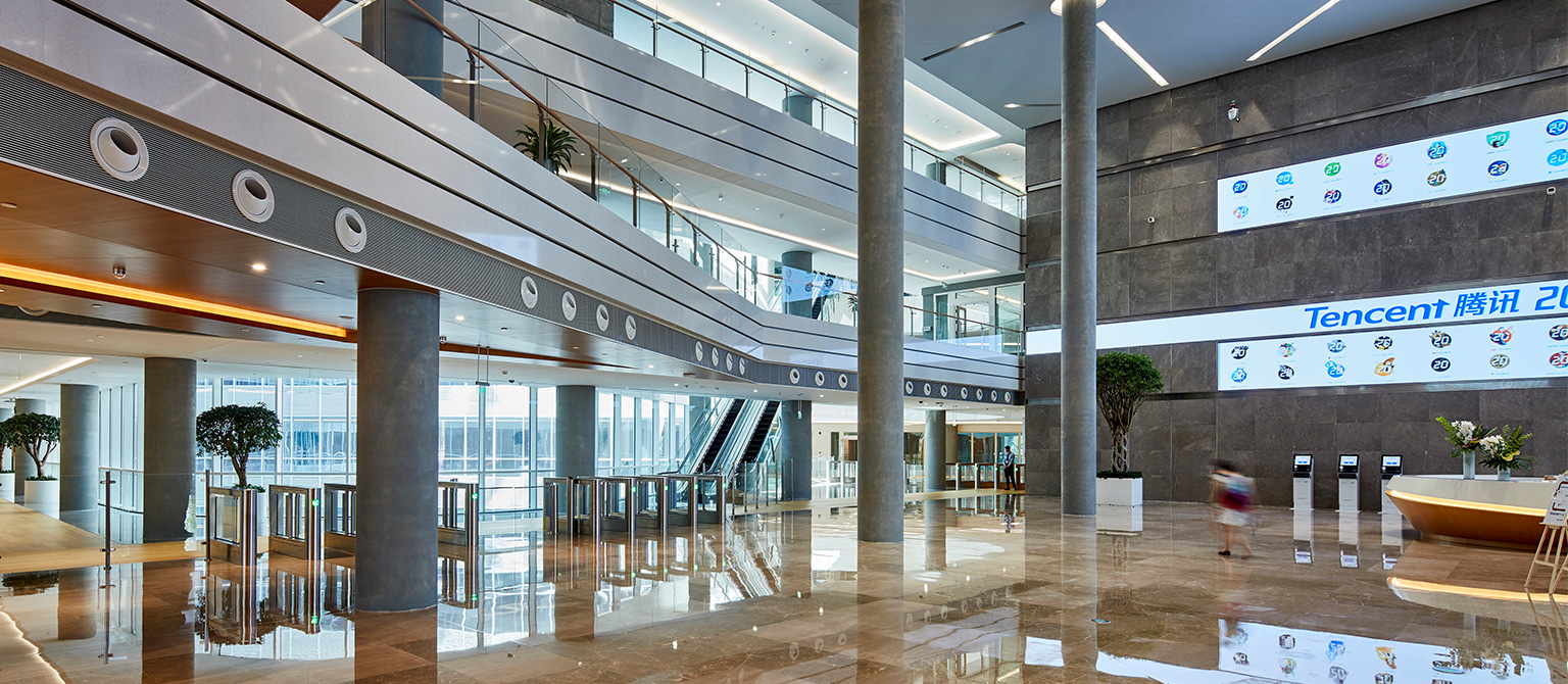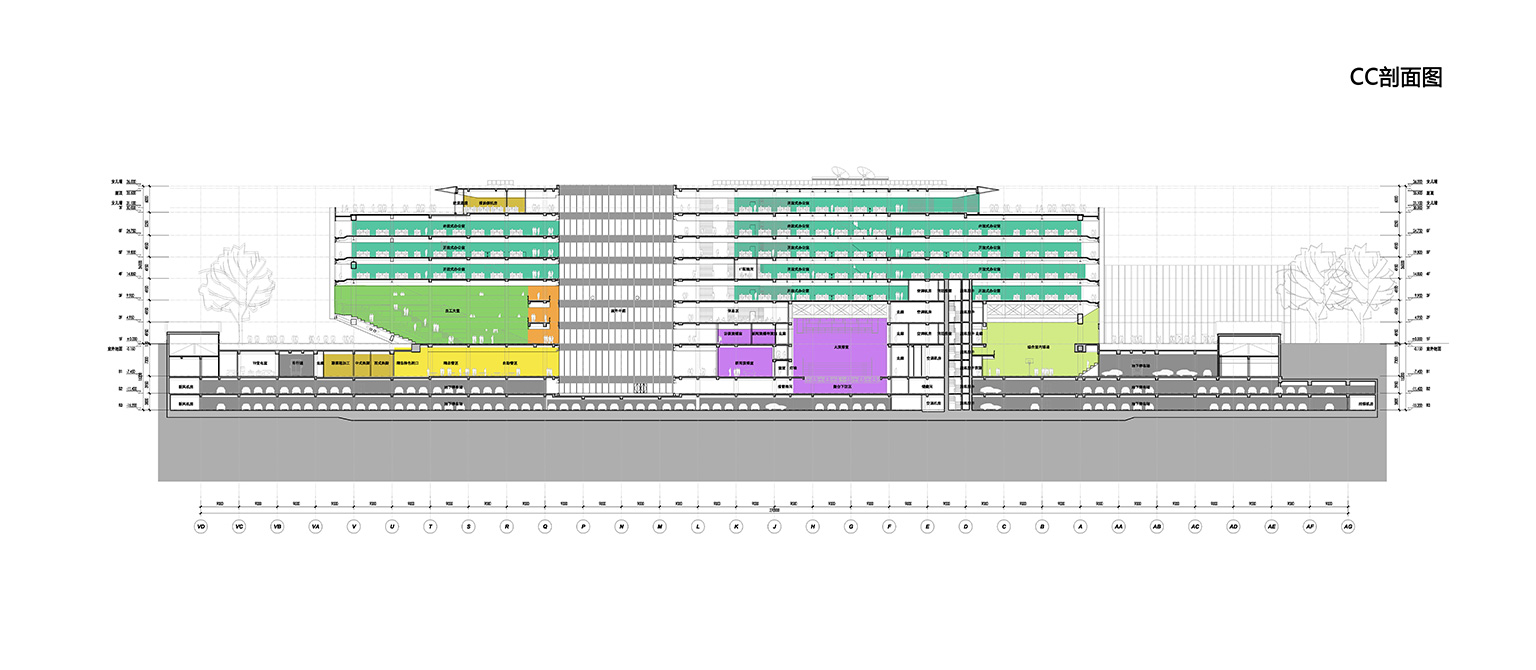 主樓地下三、二層為員工停車及設(shè)備用房;地下一層為訪客停車,后場卸貨區(qū),北側(cè)為形象店,餐廳與廚房,中區(qū)為演播功能和展廳,南區(qū)為員工運(yùn)動(dòng)設(shè)施及設(shè)備用房等。首層為員工大堂、早餐廳,中區(qū)為演播功能,南區(qū)為員工運(yùn)動(dòng)設(shè)施,西南側(cè)為公眾大堂,東南側(cè)為VIP大堂。二層為行政辦公,騰訊學(xué)院,開敞辦公室,大中小教室,多功能廳,IT機(jī)房等。三至六層為開敞辦公室。七層為總辦餐廳及總辦辦公室等。能源中心配樓地下二層為制冷機(jī)房及其配電及控制室、IT中心制冷機(jī)房等。地下一層為員工自行車停車場、消防水池、消防水泵房、空調(diào)機(jī)房、空調(diào)機(jī)房、衛(wèi)生間等。首層為鍋爐房、熱交換站、物業(yè)管理中心、柴油發(fā)電機(jī)房、10KV分界室、高壓配電室、變電室等。