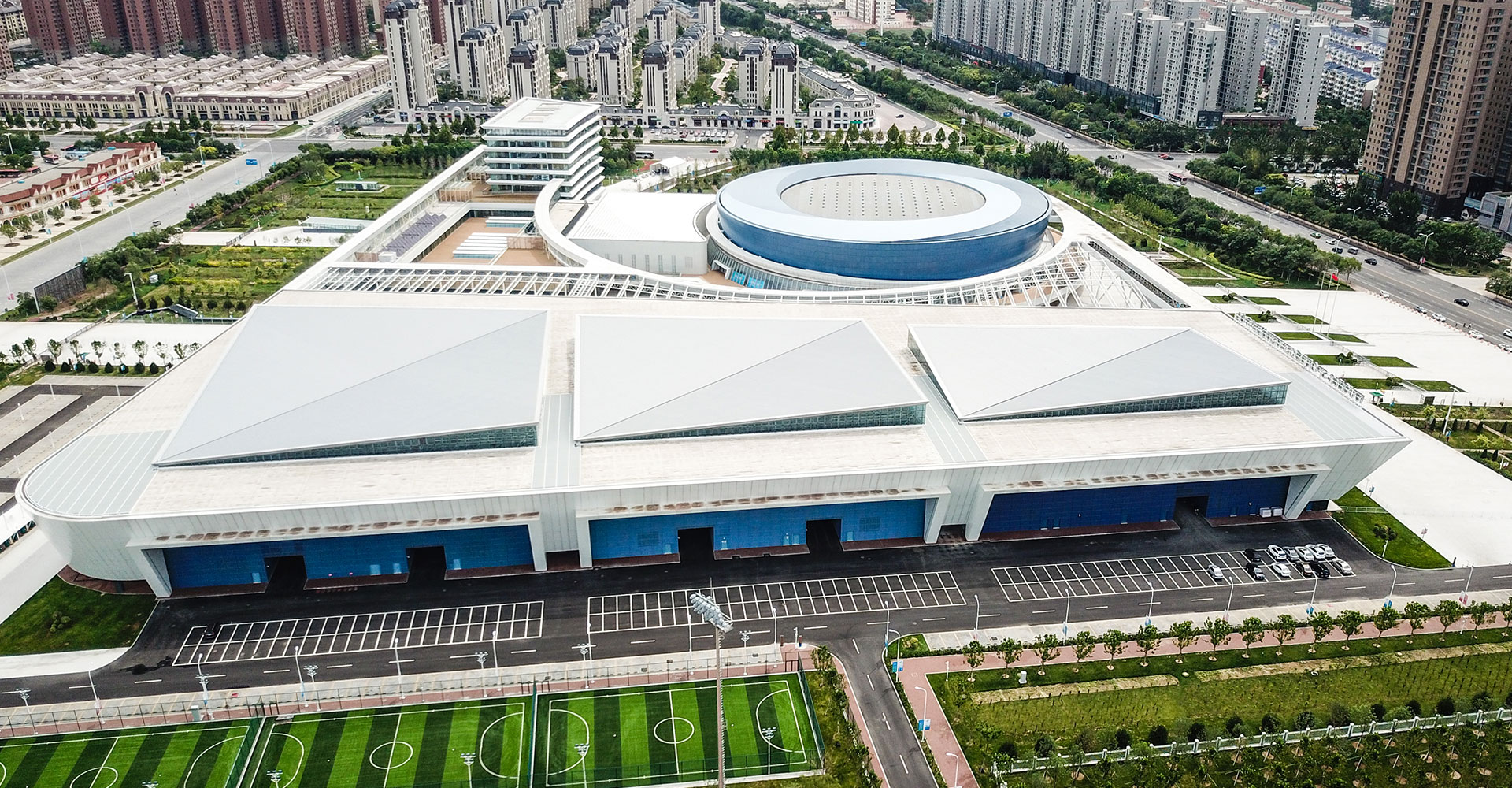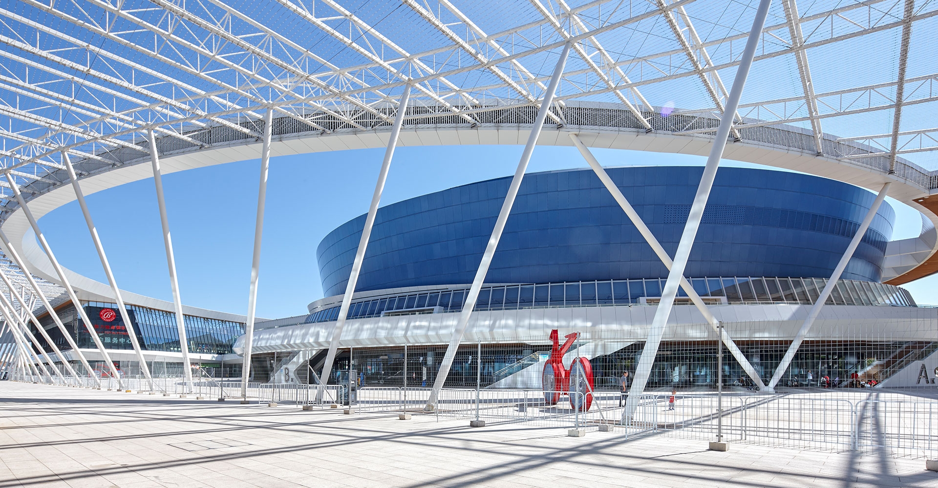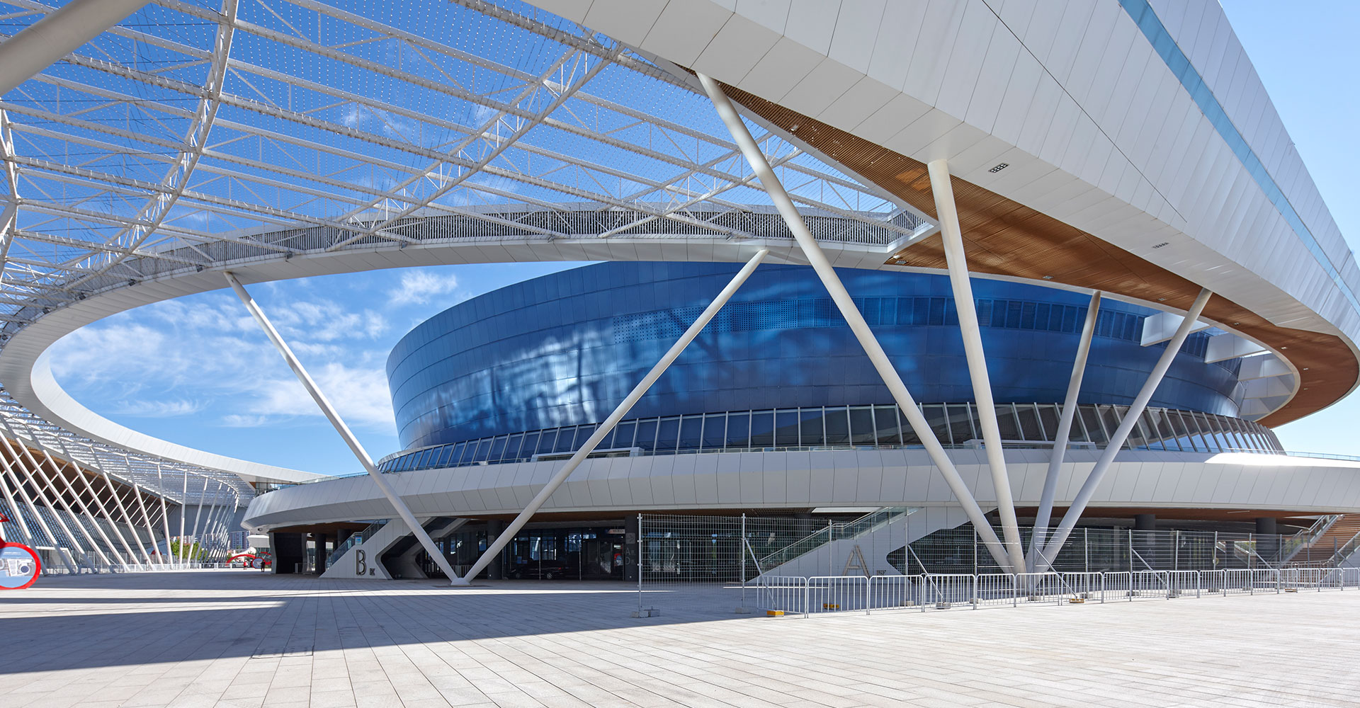 強調(diào)多個單體的體育建筑從功能到形式上的整合,同時將場館間的相對消極的空間通過半室外化的空間營造,嘗試變?yōu)榉e極的活動空間,并與城市空間相對接。在后期實際運營期間,功能一體化為使用帶來了很大的便利、空間一體化帶來了鮮明而有力的建筑形態(tài)、建筑虛空成為了提升使用者感受的“亮點空間”。
