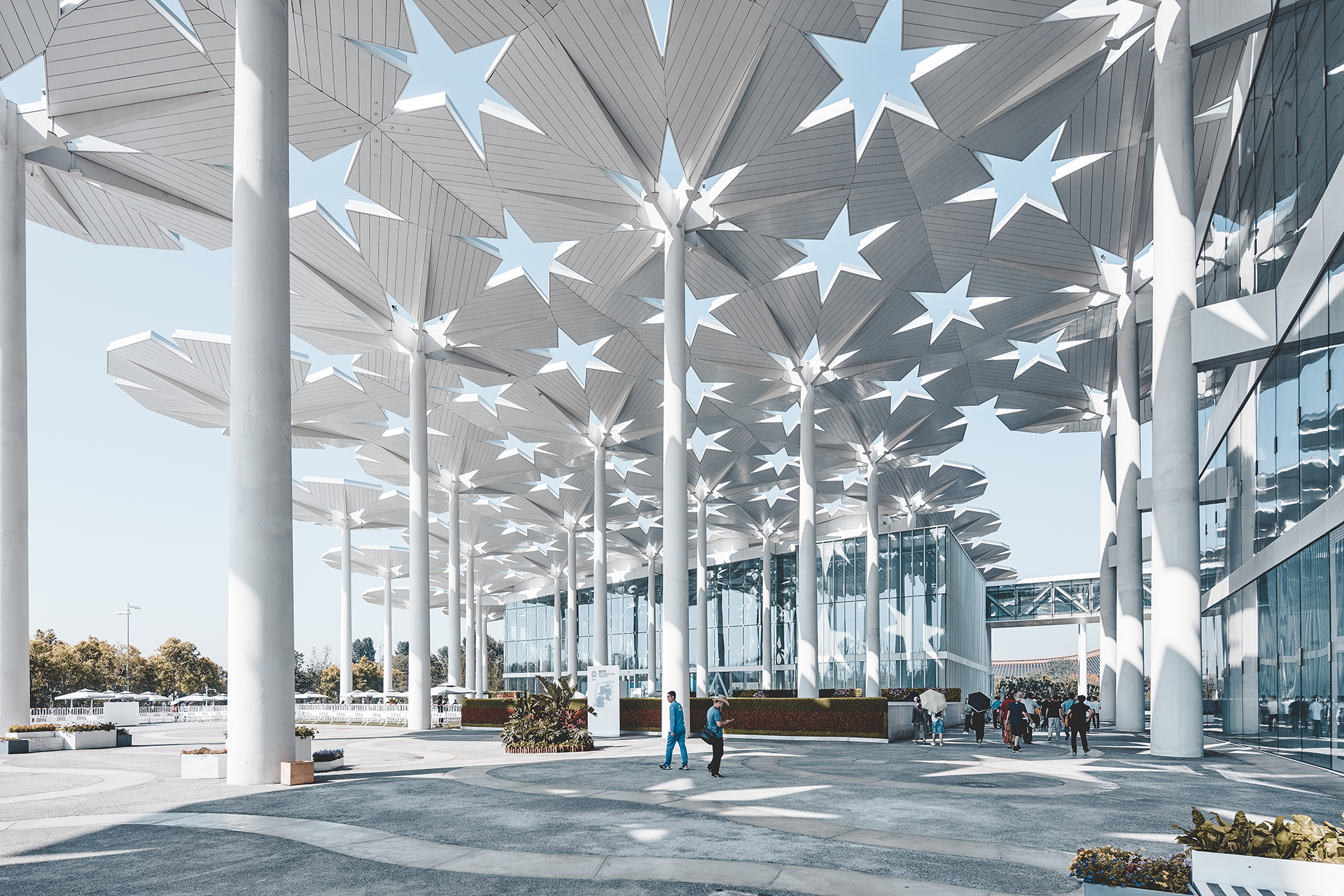 國際館屋面為輪廓為球面,94朵花傘有94種造型,設(shè)計(jì)通過縱向壓縮,將每4朵花傘統(tǒng)一為一個16.8X16.8矩陣網(wǎng)格,實(shí)現(xiàn)了對復(fù)雜造型的精確幾何控制。漏斗形花傘利于雨水排放和收集利用,花傘上方覆蓋光伏發(fā)電膜,體現(xiàn)綠色設(shè)計(jì)理念,花傘絢麗的夜景照明效果為2019北京世園會提供了最經(jīng)典的記憶。
