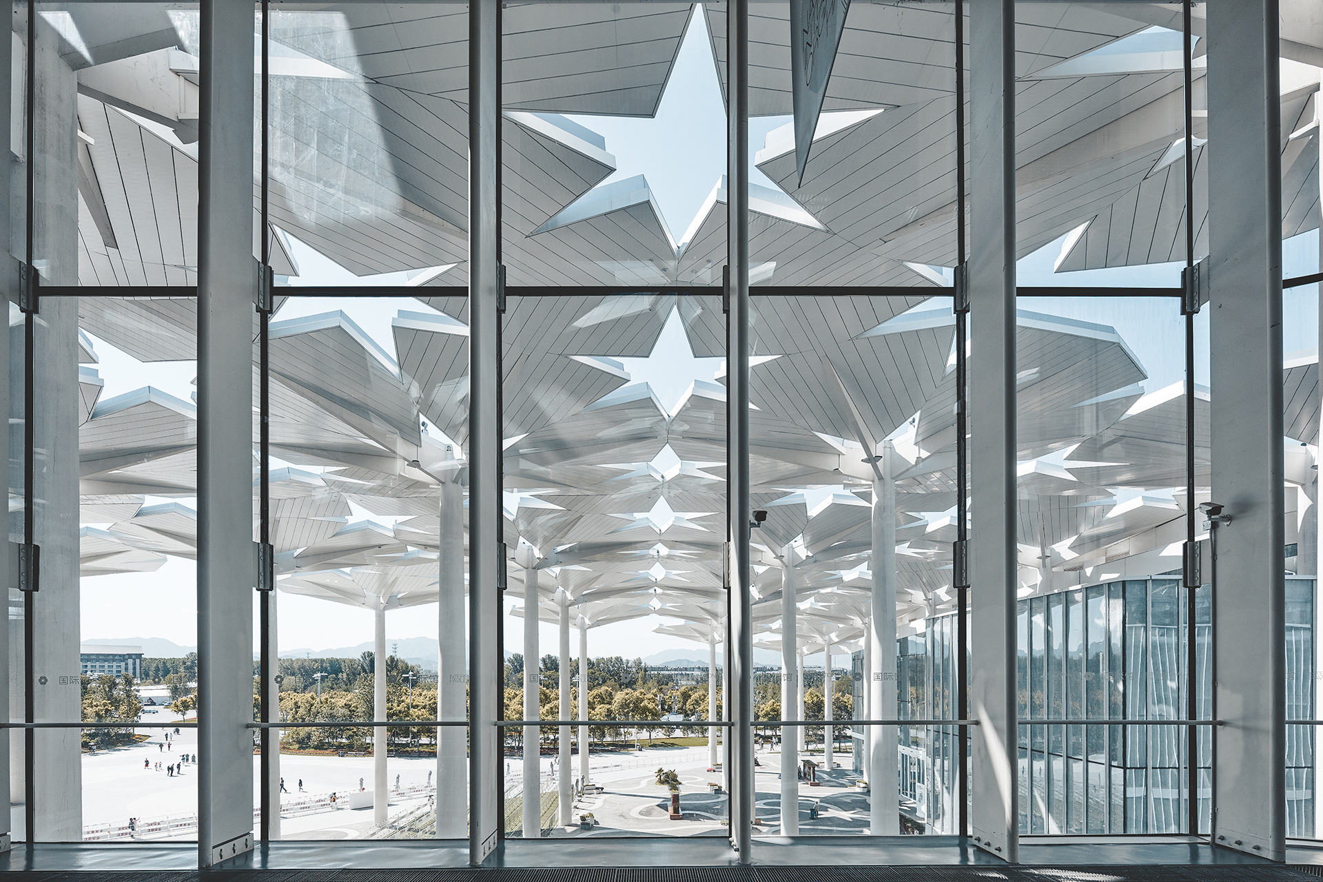 創(chuàng)新采用異型鋼框架結(jié)構(gòu)體系,實(shí)現(xiàn)建筑“花?!崩砟睢N菝?4朵“花傘”組成的“花?!?,是本項(xiàng)目最矚目的造型特點(diǎn)。結(jié)構(gòu)設(shè)計(jì)充分利用建筑“花傘”造型和找形“花瓣”的幾何邏輯,“編織”既符合建筑外觀造型又滿足結(jié)構(gòu)受力需要的異形鋼框架。通過對異形鋼框架單元和整體結(jié)構(gòu)的深入分析,證明結(jié)構(gòu)具有較好的受力特性:屋蓋平面內(nèi)剛度較大,可協(xié)調(diào)南北展廳變形和受力,結(jié)構(gòu)抗側(cè)剛度和整體性較強(qiáng);折形屋蓋通過豎向變形釋放溫度內(nèi)力,實(shí)現(xiàn)超長結(jié)構(gòu)不設(shè)縫。