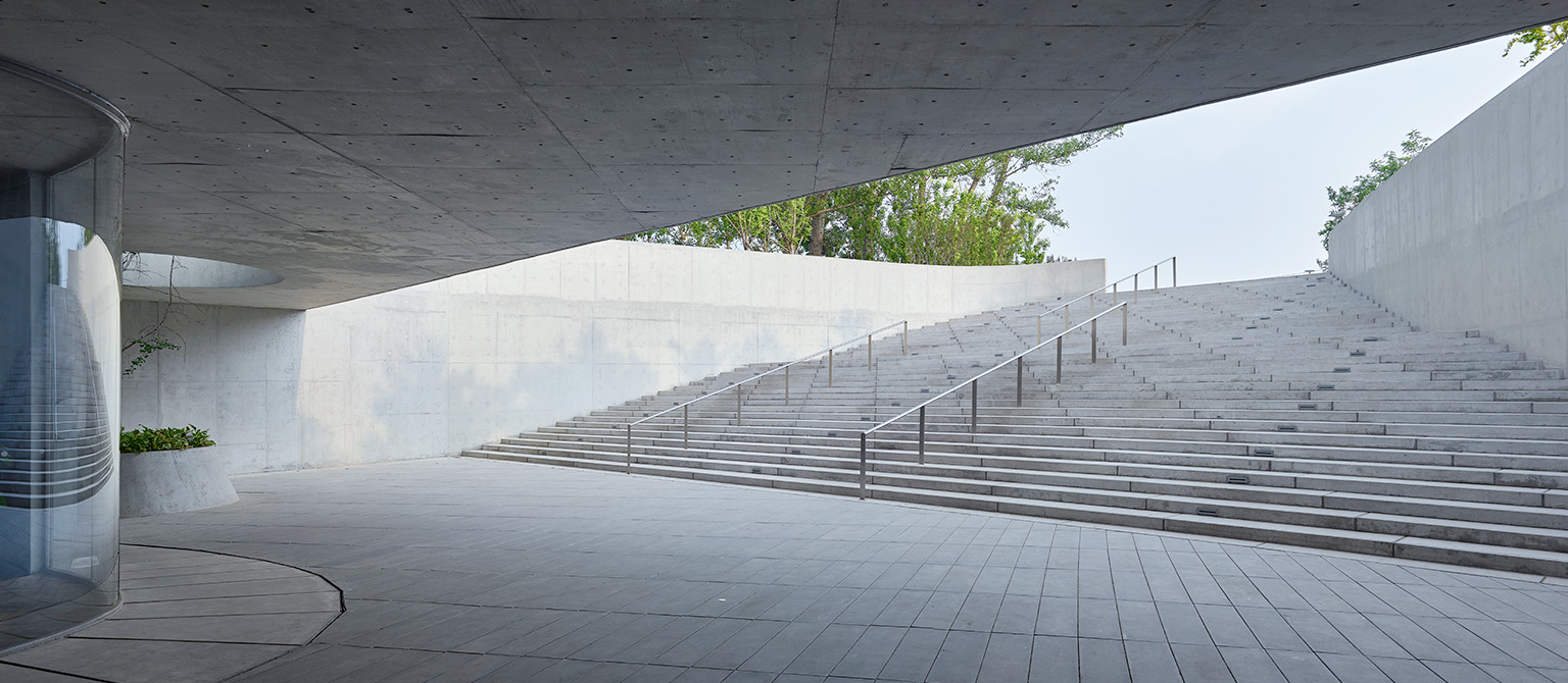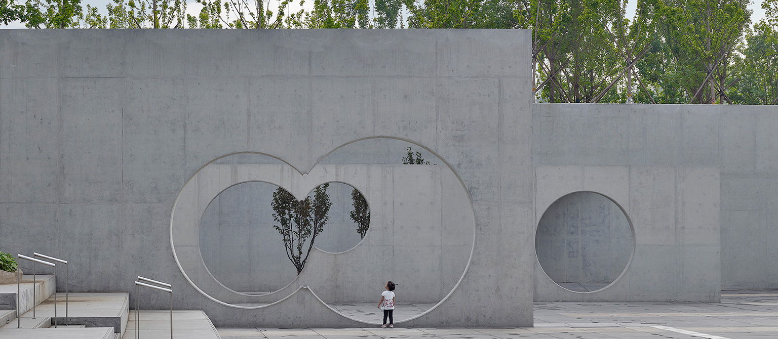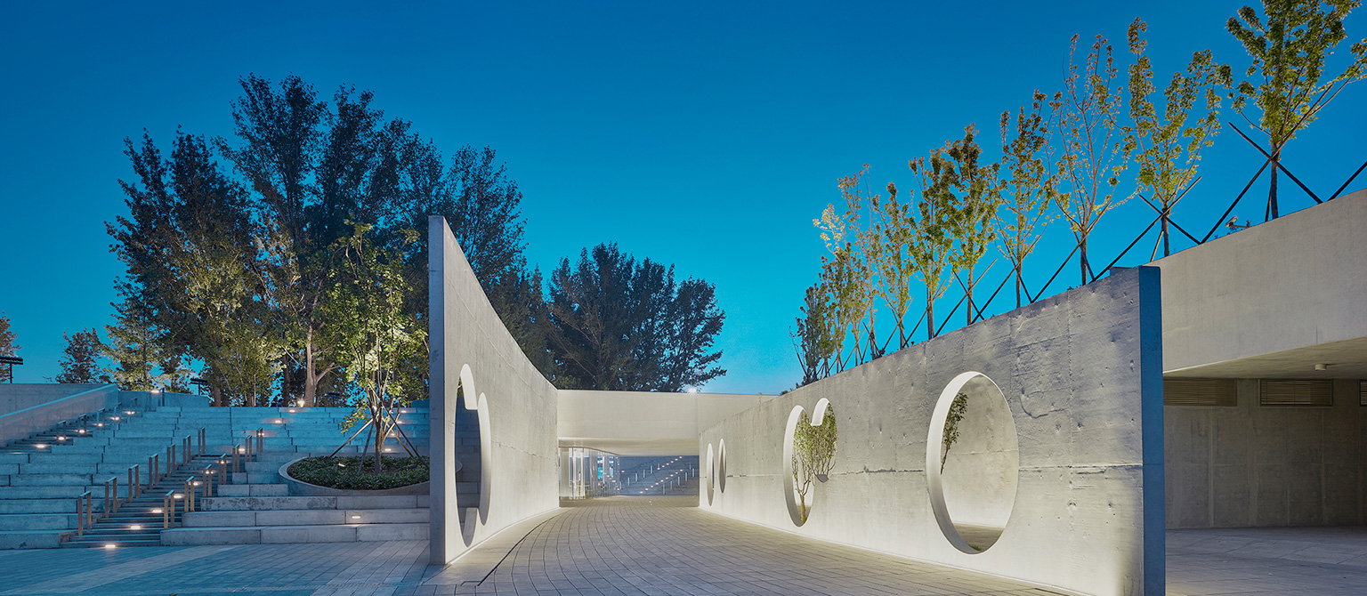 由于建筑位于公園內(nèi)部,方案以現(xiàn)代建筑語(yǔ)言結(jié)和傳統(tǒng)中國(guó)園林意境,通過(guò)下沉手法將建筑主體“隱”于公園景觀綠植當(dāng)中,為平面化的傳統(tǒng)公園創(chuàng)造出多層次、豐富的空間體驗(yàn)。通過(guò)簡(jiǎn)單、明確的幾何關(guān)系將建筑主體、植栽池、小品、鋪裝等有機(jī)統(tǒng)一,局部覆土建筑和通透的玻璃立面模糊了室內(nèi)與室外,建筑與景觀的關(guān)系。