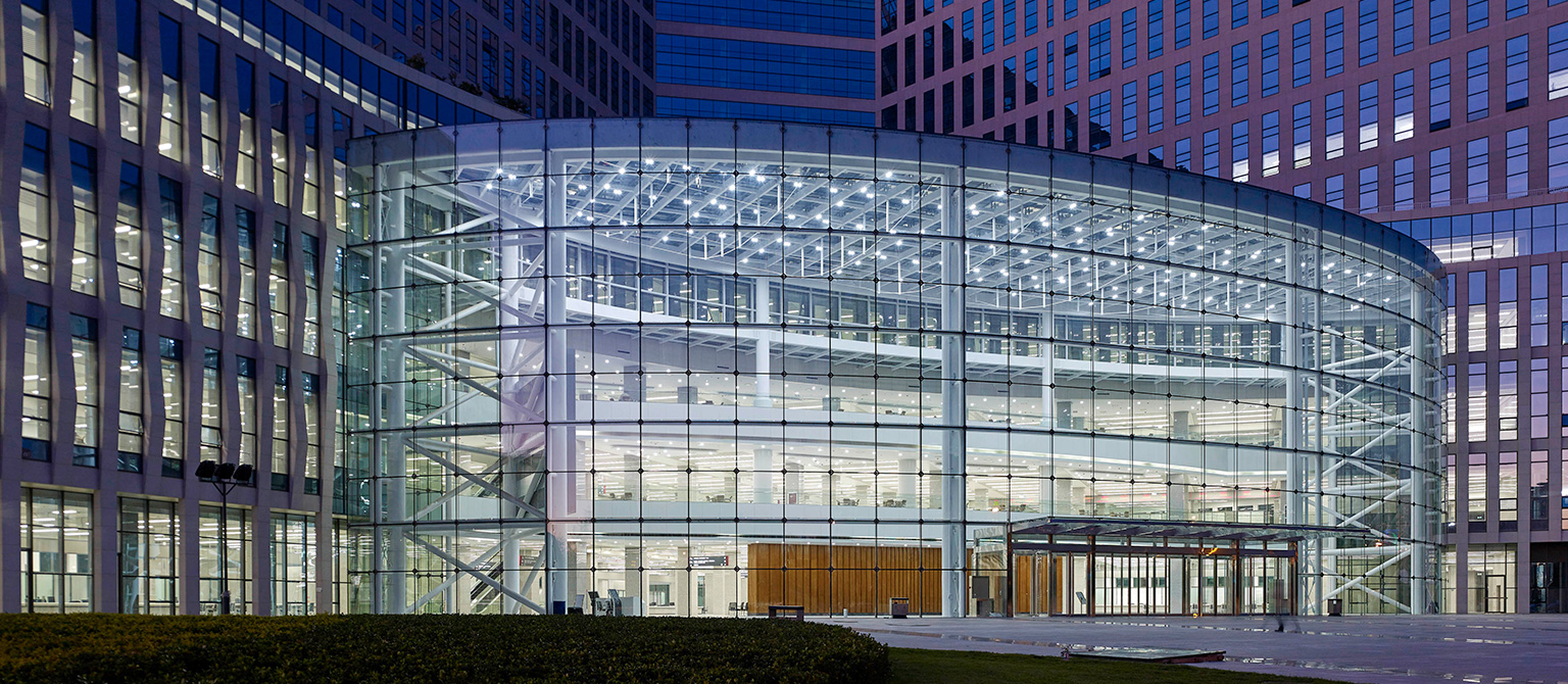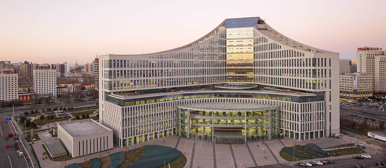 北京市政務中心,為一組辦公樓,最長方向長度接近200m,整個建筑造型是一片斜屋頂,逐層升高的形狀。為保證結構規(guī)則性,結構通過設置結構縫,將地上建筑劃分工廠7個單獨的建筑。其中辦公樓劃分為4個單獨的主樓,辦公主樓采用混凝土框架剪力墻結構,盡量在核心筒和分縫處設置剪力墻。為解決高樓混凝土柱截面過大的問題,在下部幾層柱中設置鋼骨。裙房通過設縫劃分成3個主樓。主要入口的葉子大廳采用鋼結構。葉子大廳縱向長度69m 橫向長度23m。葉子大廳豎向和抗側力體系采用兩個大的鋼管三角桁架設置在葉子大廳兩端,屋面結構為張懸梁結構,使整個屋頂結構看起來比較輕巧通透。葉子大廳與裙房的部分連接采用滑動支座。裙房五層采用框架結構,在裙房的頂層有一個跨度報告大廳,短向跨度25m,采用了預應力混凝土梁結構。整個建筑基礎采用了梁筏基礎,本工程持力層為卵石層,承載力較高,最高塔樓22層也采用天然地基。由于地下室較深,抗浮水位較高,裙房部分存在抗浮問題,通過回填鋼渣回混凝土解決。