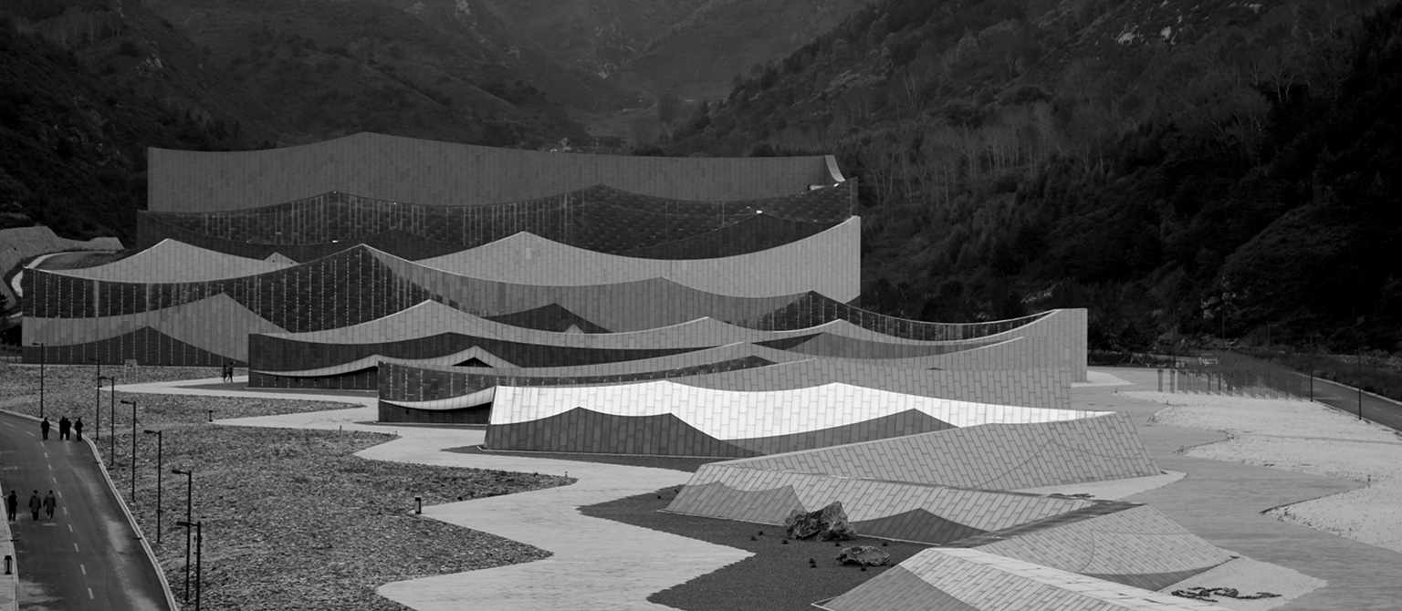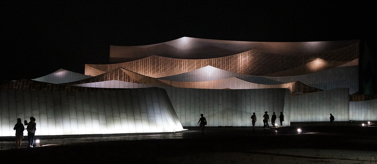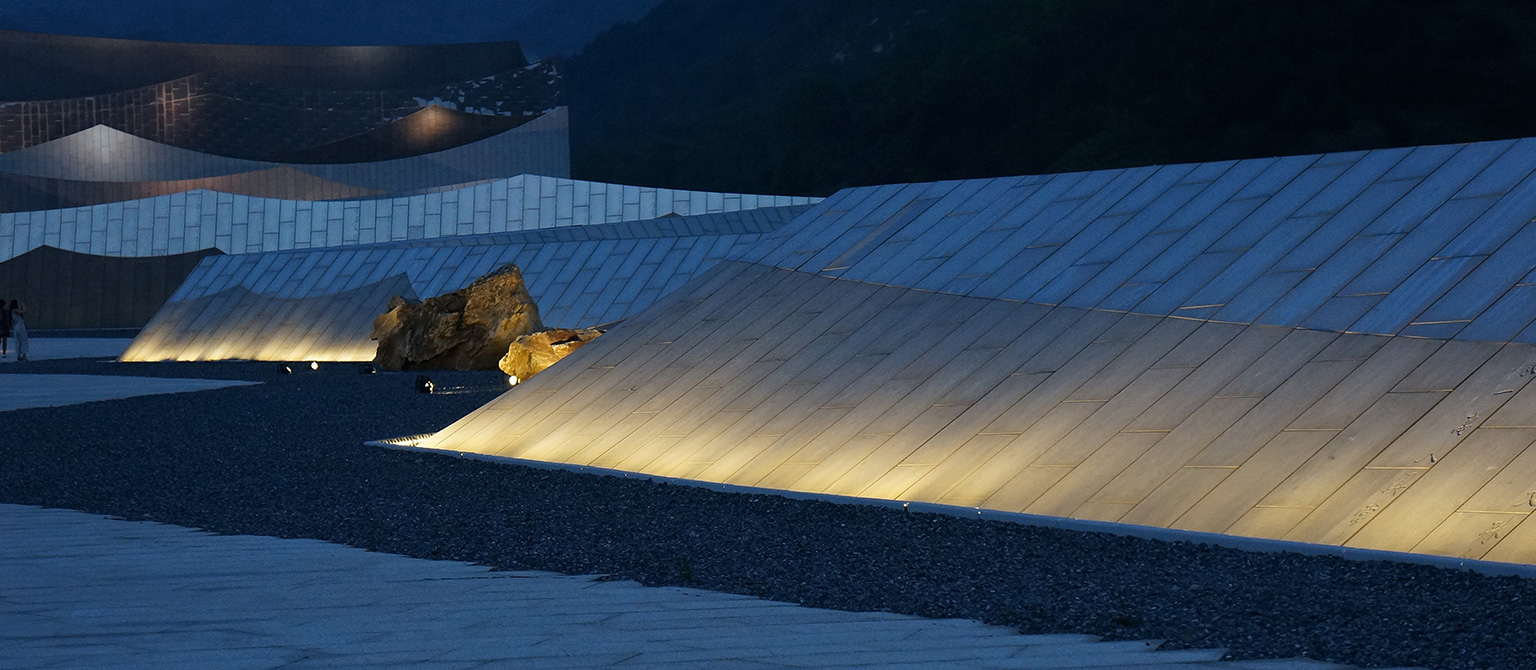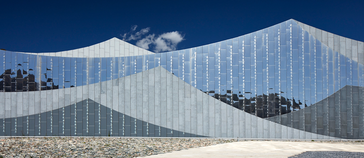 她以約700米長(zhǎng)、徐徐展開(kāi)的“經(jīng)折”置于劇場(chǎng)之前,由高到低排列形成漸開(kāi)的序列,成為劇場(chǎng)表演前奏的序曲,承載著讓游人平復(fù)情緒、感知所在的功能。而劇場(chǎng)就成為了還沒(méi)有、或正在被打開(kāi)一本博大的經(jīng)書(shū),預(yù)示蘊(yùn)藏著知識(shí)和智慧的寶庫(kù)。在接近景區(qū)道路的一端,“經(jīng)折”以高反光的不銹鋼頂面直接插入碎石的地面,突出了“經(jīng)折”構(gòu)造的力度和純度,對(duì)日空和月夜的映照成為最先映入觀眾眼簾的形象。