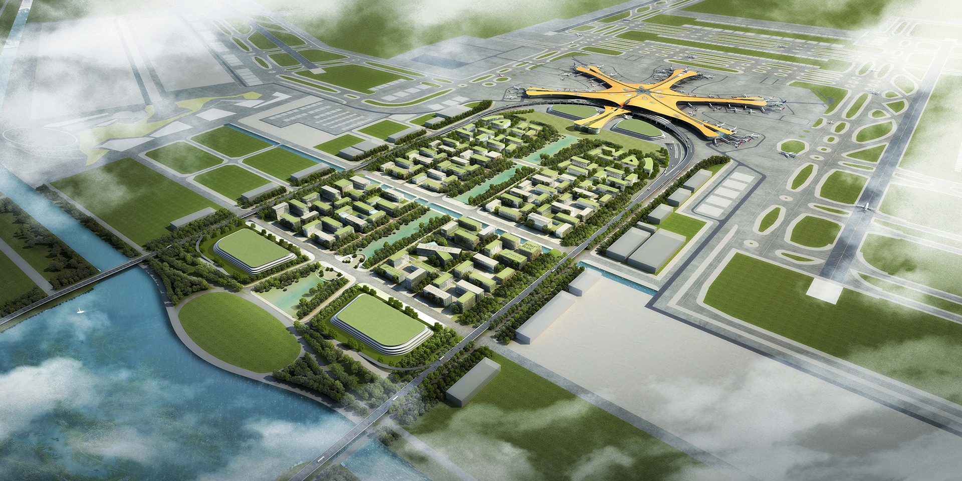 規(guī)劃將近遠(yuǎn)期相結(jié)合,提高機(jī)場(chǎng)區(qū)域土地的利用效率,使機(jī)場(chǎng)與城市有機(jī)結(jié)合,保障機(jī)場(chǎng)、鐵路的人流、貨流運(yùn)輸能力和安全,做到系統(tǒng)清晰、運(yùn)行有序、邊界明確、合理分區(qū)。 規(guī)劃從整體城市空間角度出發(fā),對(duì)機(jī)場(chǎng)航站樓前核心區(qū)的交通流線、開放空間、整體空間形態(tài)、街區(qū)模式等進(jìn)行研究,并對(duì)航站樓前的中央景觀帶、地下空間以及主要功能區(qū)展開專題研究。