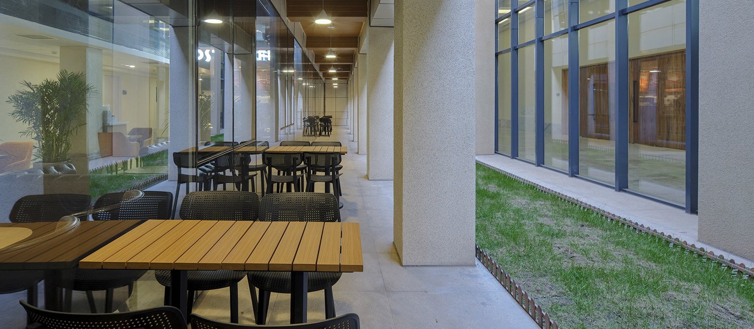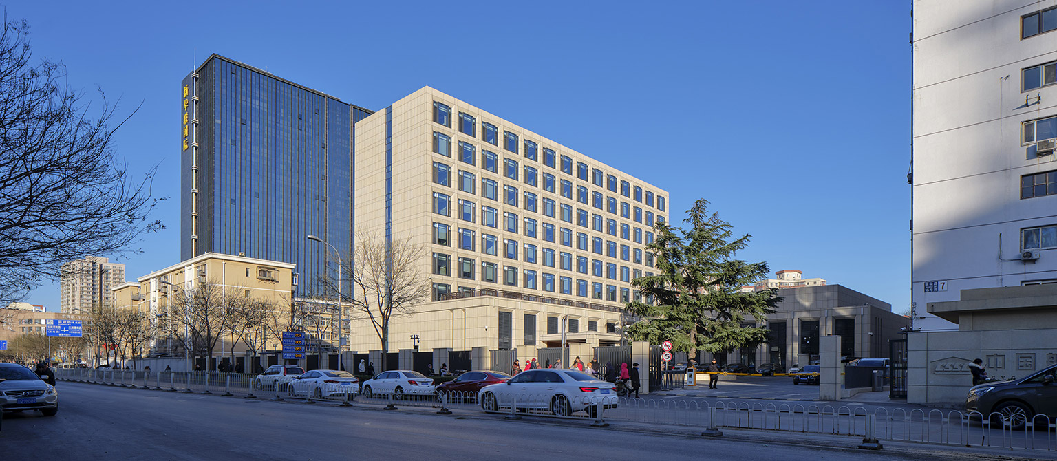 1)拆除重建多功能廳,設(shè)置地下室作為消防水池和泵房等設(shè)備用房;2)主樓南側(cè)新建兩層通高度裙房,與主樓脫開兩個(gè)內(nèi)天井,作為人員休息場(chǎng)所。3)注重光影效果,大堂區(qū)域采用兩層通高的落地玻璃幕墻,塑造了明亮通透的室內(nèi)空間形象。4)對(duì)樓電梯、核心筒進(jìn)行改造,更好的適應(yīng)使用功能的需求,并滿足現(xiàn)行規(guī)范的要求。