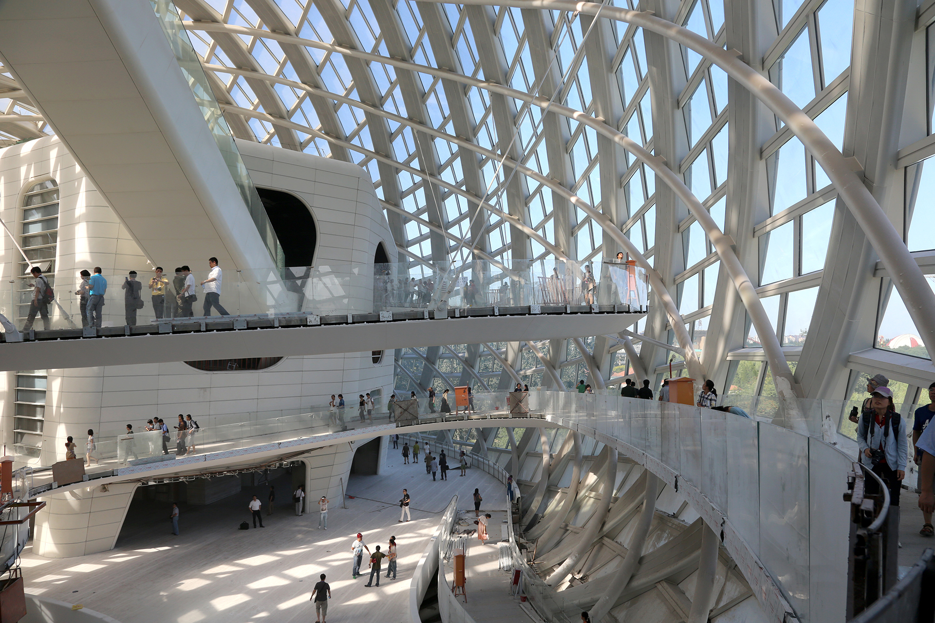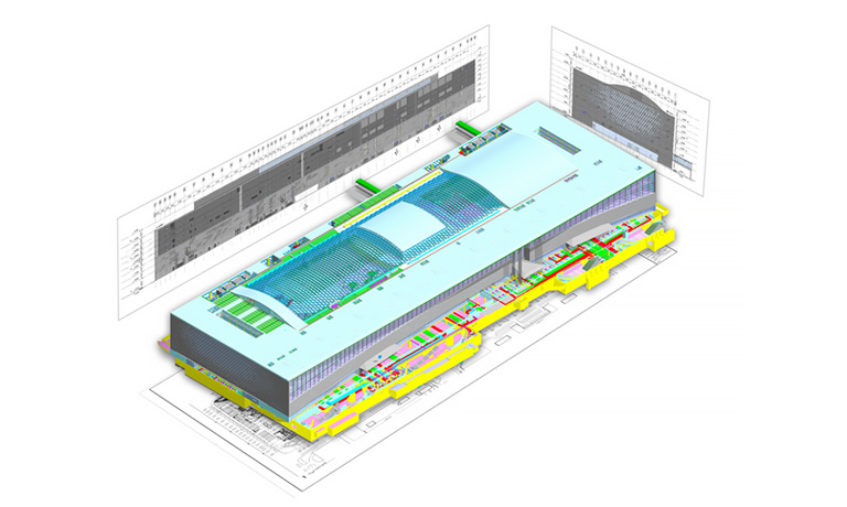 由于獨特的創(chuàng)意構(gòu)思,鳳凰中心具有復(fù)雜的三維形體,將這樣的復(fù)雜形體在設(shè)計建造中實現(xiàn)具有很高的科技含量。設(shè)計團隊通過長達6年的探索與挑戰(zhàn),利用數(shù)字化技術(shù)解決了大量前所未有的技術(shù)難題。項目在設(shè)計深化、加工、建造的全過程開創(chuàng)性的大量運用了三維數(shù)字化技術(shù),形成了一系列科技創(chuàng)新技術(shù):設(shè)計團隊利用數(shù)字技術(shù)指導(dǎo)全過程設(shè)計控制與優(yōu)化。首創(chuàng)性的構(gòu)建了適用于高精度控制要求的數(shù)字技術(shù)平臺,創(chuàng)建高質(zhì)量建筑信息模型與數(shù)據(jù)庫,實現(xiàn)了對所有建筑可視面的優(yōu)化。首創(chuàng)性的構(gòu)建了建筑幾何控制系統(tǒng),精確解決了當(dāng)代復(fù)雜建筑設(shè)計控制中建筑系統(tǒng)之間的定位“拼合”問題。結(jié)構(gòu)設(shè)計開啟了復(fù)雜形體建筑的新模式,創(chuàng)造性的采用了“雙向疊合網(wǎng)格結(jié)構(gòu)體系”。首創(chuàng)了“彌合自由曲面的單向非連續(xù)折板幕墻體系”。用平板幕墻彌合大曲率自由曲面。并在加工生產(chǎn)全過程實現(xiàn)了與數(shù)字化設(shè)計控制的無縫對接。
