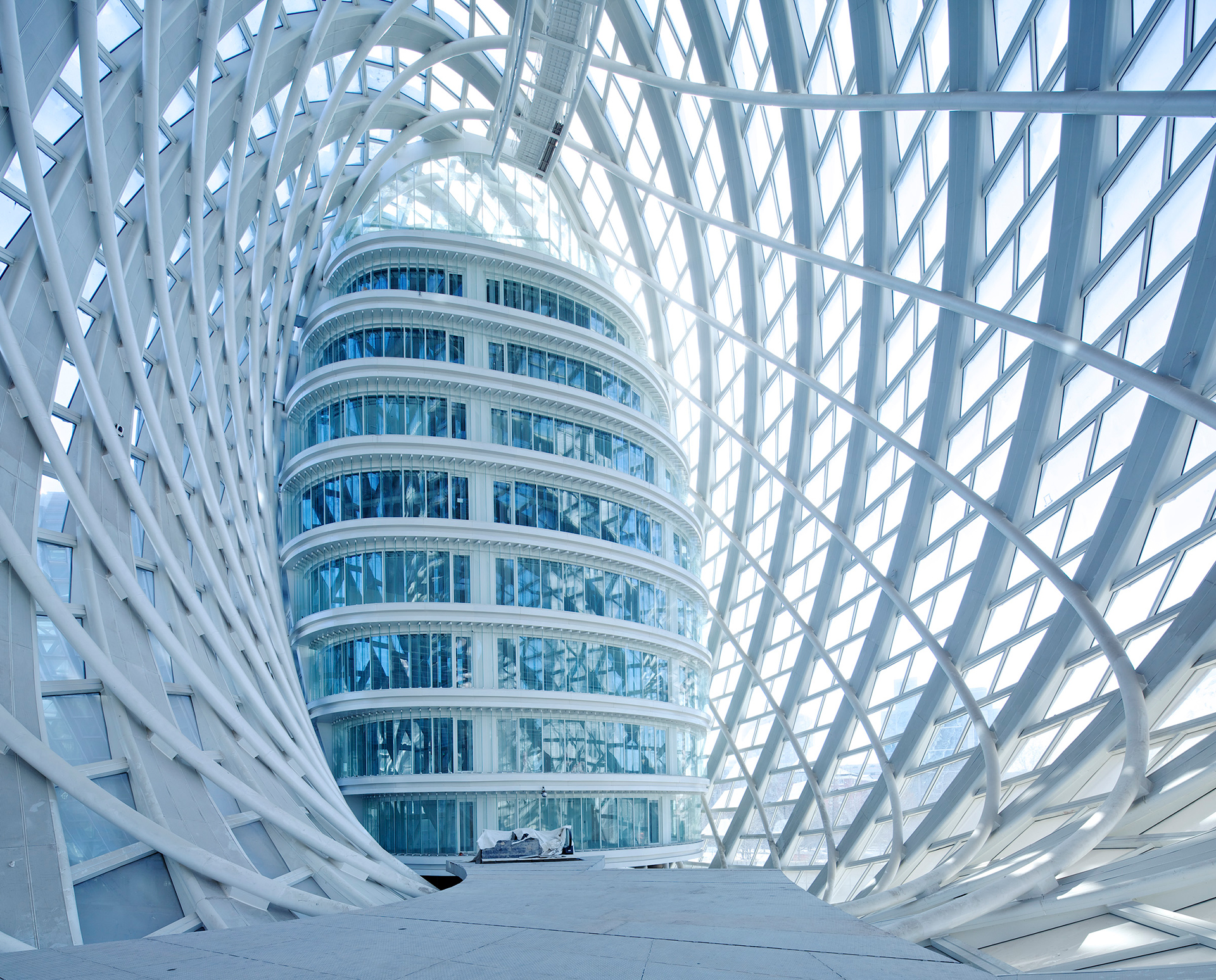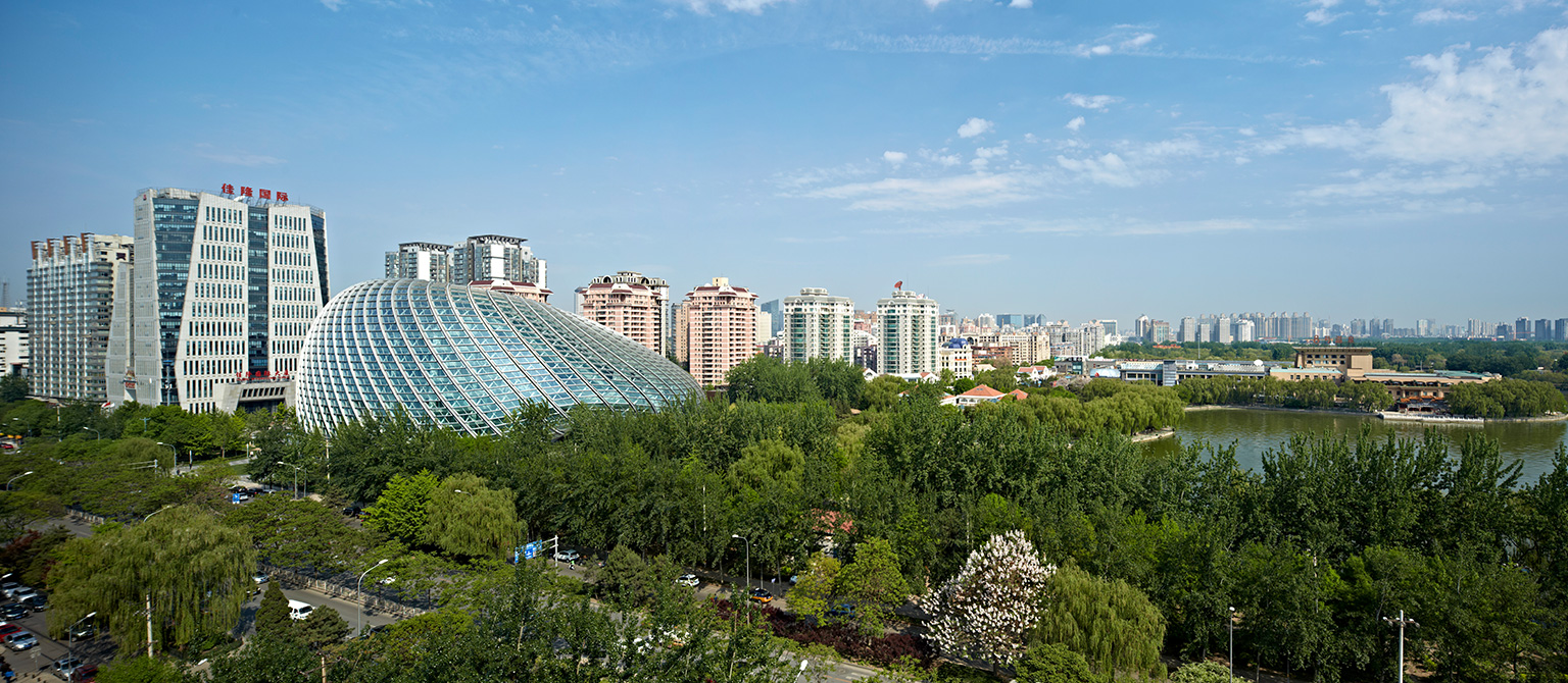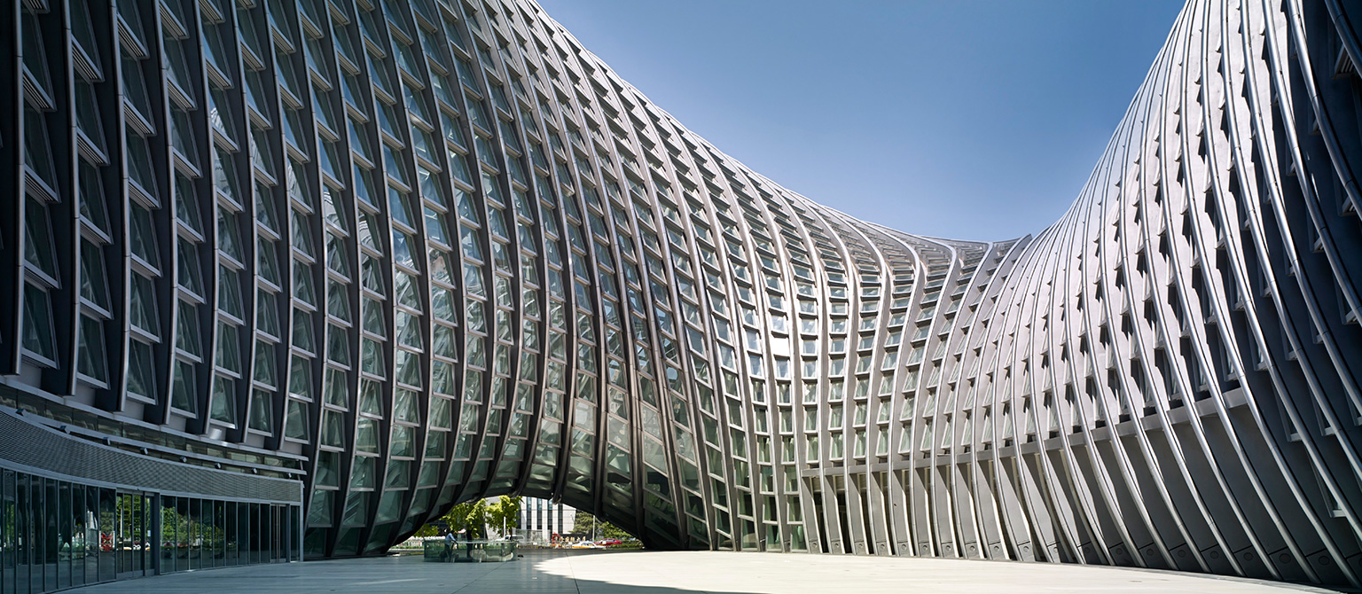 此外,整個建筑也體現(xiàn)了對綠色節(jié)能和低碳環(huán)保的設(shè)計理念。光滑外形沒有設(shè)一根雨水管,所有在表皮形成的雨水順著外表的主肋導(dǎo)向建筑底部連續(xù)的雨水收集池,經(jīng)過集中過濾處理后提供藝術(shù)水景及庭院澆灌。建筑具有單純?nèi)岷偷耐鈿?,除了其自身的美學(xué)價值之外,也有緩和北京冬季強烈的高層建筑的街道風(fēng)效應(yīng)的作用。建筑外殼同時又是一件“綠色外衣”,它為功能空間提供了氣候緩沖空間。建筑的雙層外皮很好地提高功能區(qū)的舒適度和建筑能耗。設(shè)計利用數(shù)字技術(shù)對外殼和實體功能空間進行量體裁衣,精確地吻合彼此的空間關(guān)系。共享空間利用30米的高差的下大上小的煙囪效應(yīng),在過渡季中,可以形成良好的自然氣流組織,節(jié)省能耗。