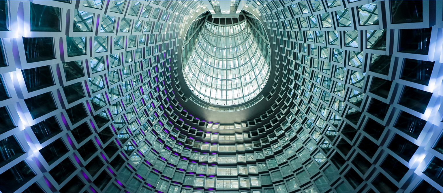 由于位于環(huán)形軸線上的地下柱子已經(jīng)建成,為了實現(xiàn)與放射軸線控制的地上外幕墻柱的連接,在首二層采用V柱進(jìn)行轉(zhuǎn)換,將地下結(jié)構(gòu)通過極具表現(xiàn)力的手法轉(zhuǎn)換到樓上結(jié)構(gòu),同時符合結(jié)構(gòu)受力特性。屋頂Y柱作為外幕墻柱在穹頂?shù)难由欤瑫r也具備重要的視覺需求。為了降低截面尺寸,設(shè)計將其模擬樹形分叉,在頂部收攏到一個圓環(huán)。內(nèi)穹頂結(jié)構(gòu)也沿放射軸線向中心匯聚到核心筒,最終與外穹頂網(wǎng)架聯(lián)系在一起,形成了非常穩(wěn)定的雙層穹頂結(jié)構(gòu)。