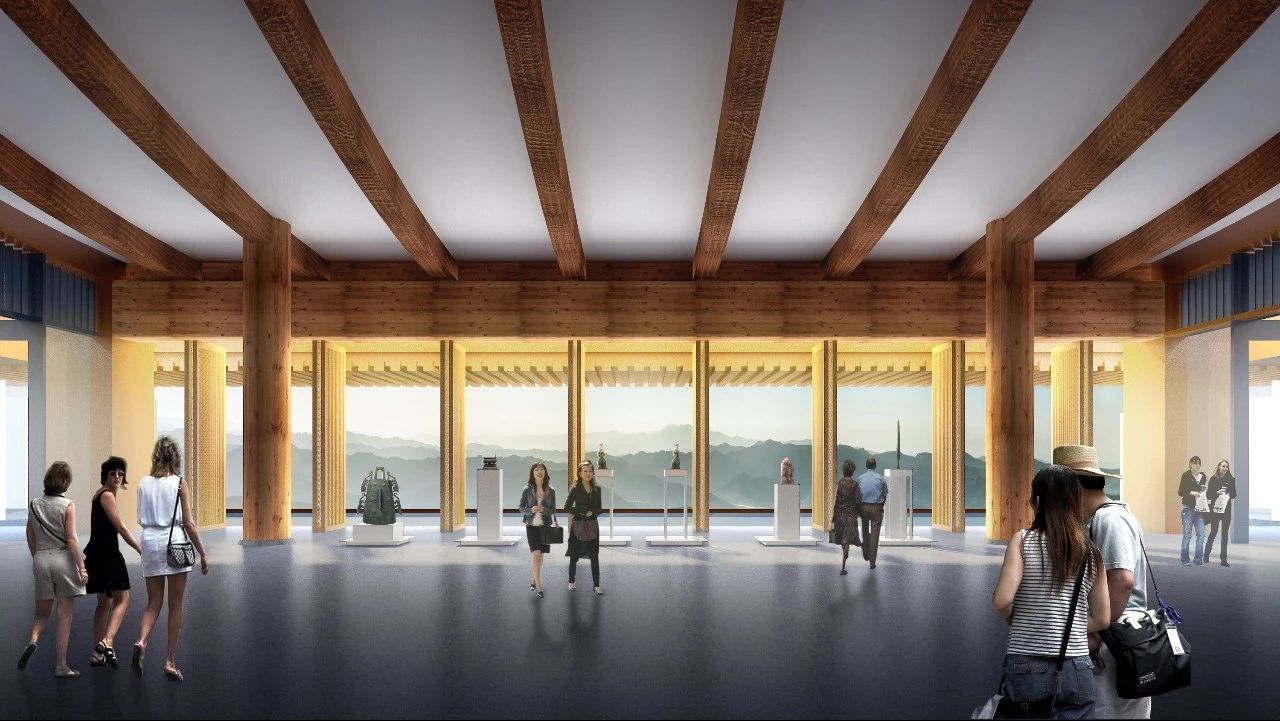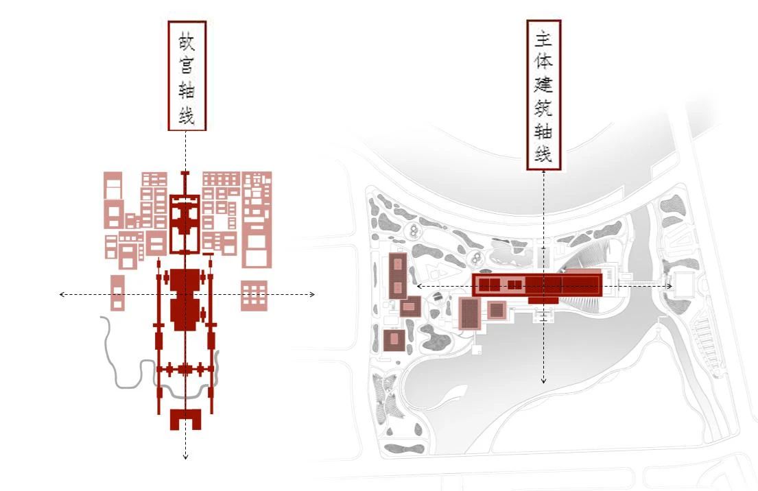 結(jié)合地形條件,在建筑的最終設(shè)計規(guī)劃中,將對外文物展覽布置在了場地東側(cè),較為私密的文物庫房、修復(fù)及后勤功能則布置在場地西側(cè),最大限度滿足功能布局的同時,也有利于分期建設(shè)。這種南側(cè)臨水、北面疊山的線性格局,也是呼應(yīng)了中國傳統(tǒng)“堪輿”理論的理想布局?!拜S線是形制的根基。故宮有一條中軸線,北院區(qū)的中軸線也是寓意故宮核心‘天際線’。我們想通過這種均衡的軸線布局方式與散點的構(gòu)成邏輯向紫禁城致敬,也是在傳承著故宮的歷史文化底蘊?!?/span>