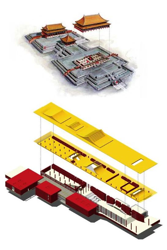 在遵循招標(biāo)投標(biāo)法的公開、公平、公正及規(guī)范性原則下,2015年,故宮博物院創(chuàng)新性地邀請中青年設(shè)計大師分別提交方案。最終,張宇的不特意體現(xiàn)新建筑而呼應(yīng)中國傳統(tǒng)“堪輿”理論的布局方案脫穎而出,也就是后來為公眾所知道的“金頂建筑形成一條軸線”方案。